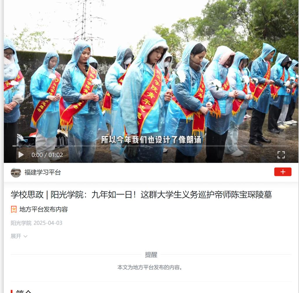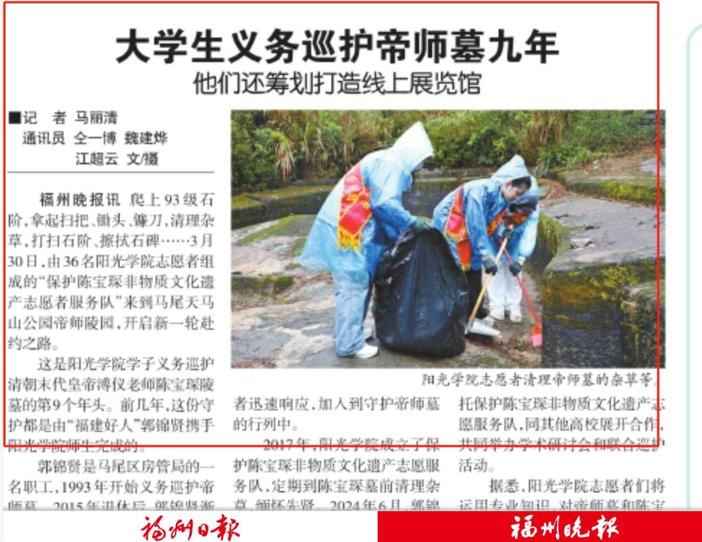 阳光学院有关负责人表示,2017年,学校还特别成立了保护陈宝琛非物质文化遗产志愿服务队,定期到墓前清理杂草,缅怀先贤。直到2024年6月郭锦贤过世,阳光学院青年志愿者们遵守着和郭锦贤的“约定”,全面接过了义务巡护的接力棒。