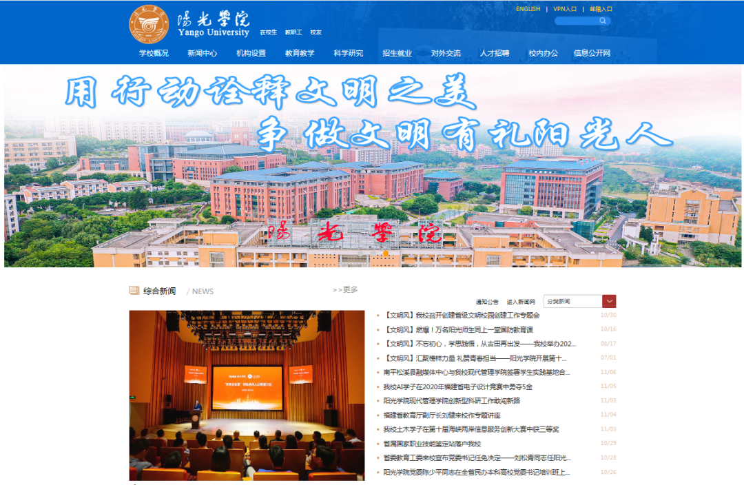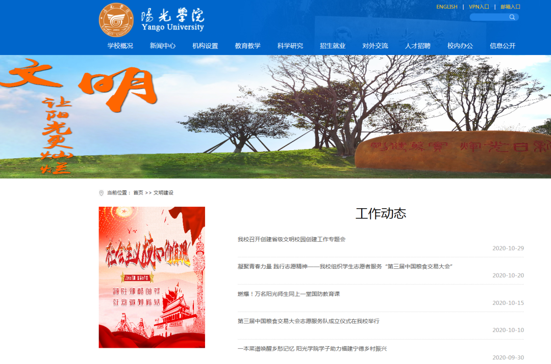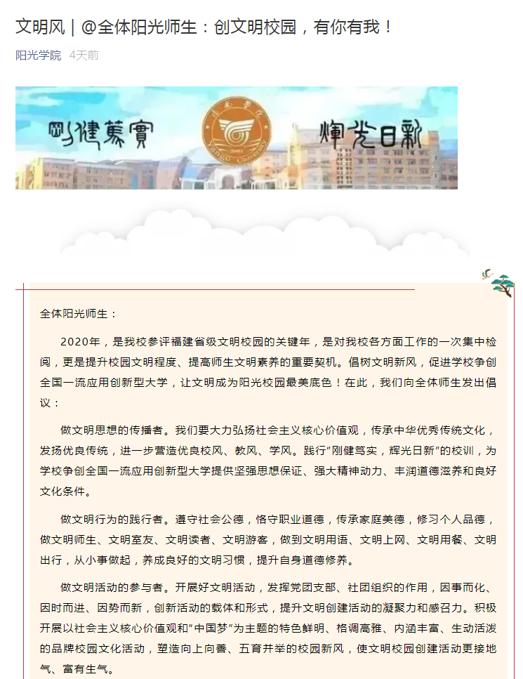 校园的主干道、食堂、候车亭等场所充分融入了社会主义核心价值观和文明创建公益广告等文化景观,在营造浓厚文明创建氛围的同时也潜移默化影响着阳光师生的一言一行。同时,学校充分利用新媒体平台广泛开展多形式、多角度、多层次、全方位的宣传,助力文明校园创建。学校官方网站开设“做文明有礼阳光人”专栏,微信公众号推出“文明风”系列专题推文,创新利用抖音平台推出文明主题小视频,多平台共同传递着积极向上的文明新风。