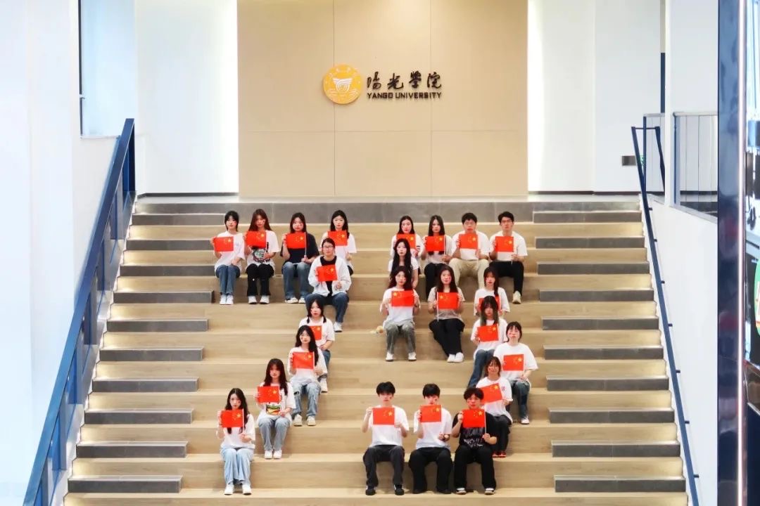 75周年国庆活动,阳光学子组织在教学楼的楼梯上,手拿五星红旗,摆出数字“75”,氛围青春洋溢,充满爱国主义情怀,旨在培养新时代大学生的爱国主义信念。